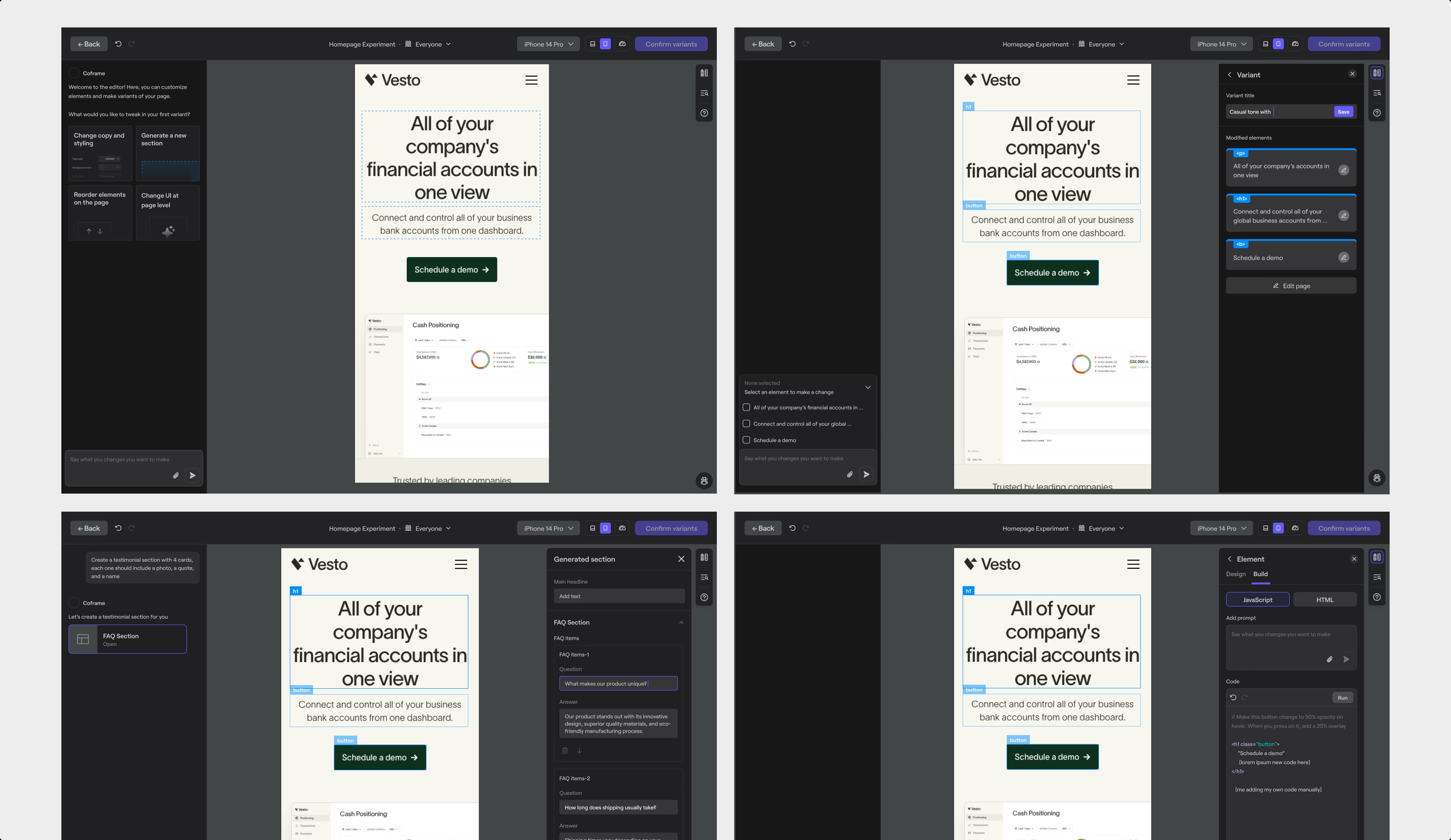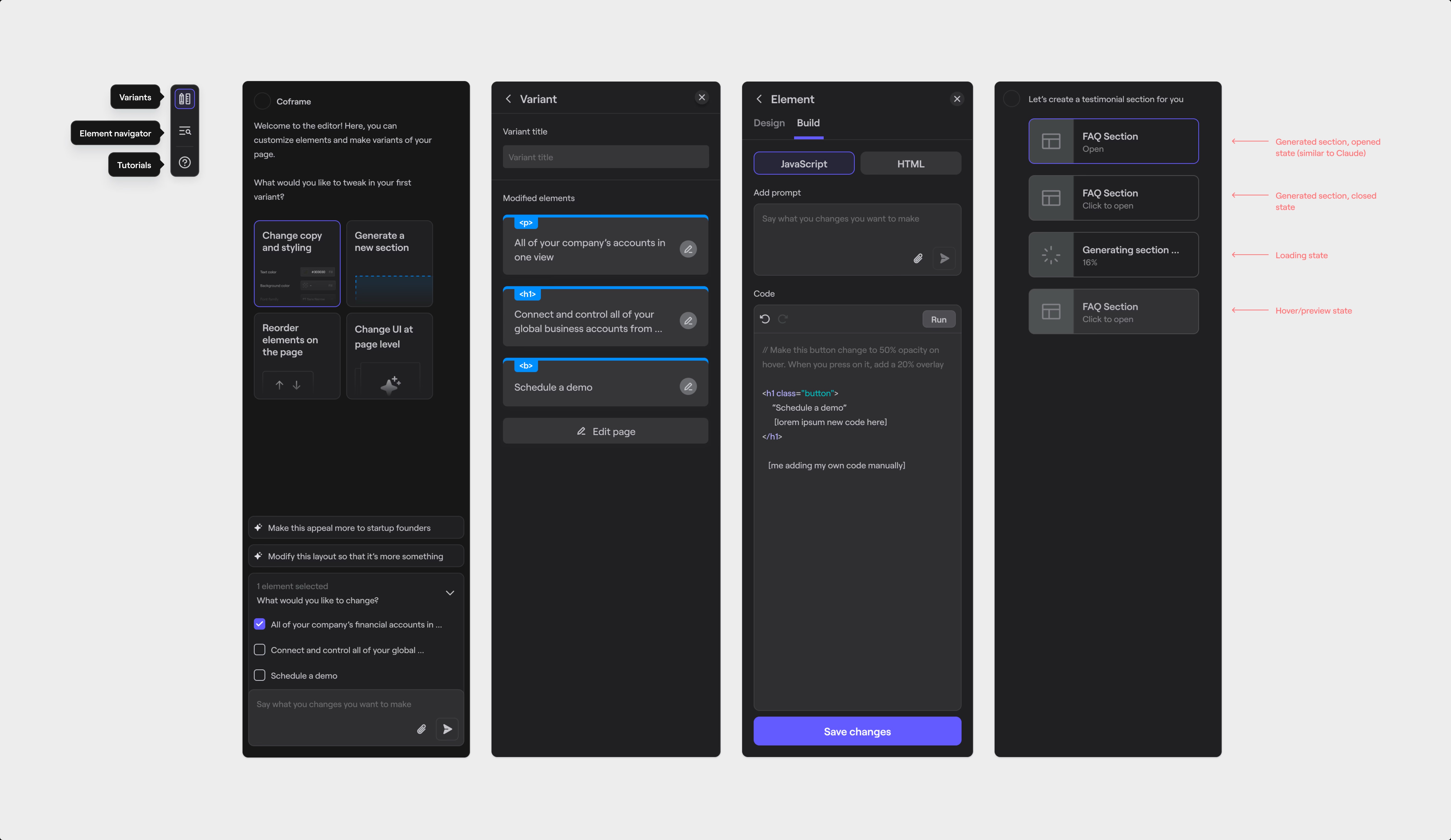 The final editor brought Coframe’s AI capabilities into a focused, approachable workflow. Users could generate new sections, edit copy or elements, and preview variants side by side. A chat-first panel guided the process, while element and variant controls remained available without overwhelming the interface. This structure highlighted the “magic moment” of instantly seeing AI-powered changes, while keeping the editor clear, flexible, and easy to navigate.